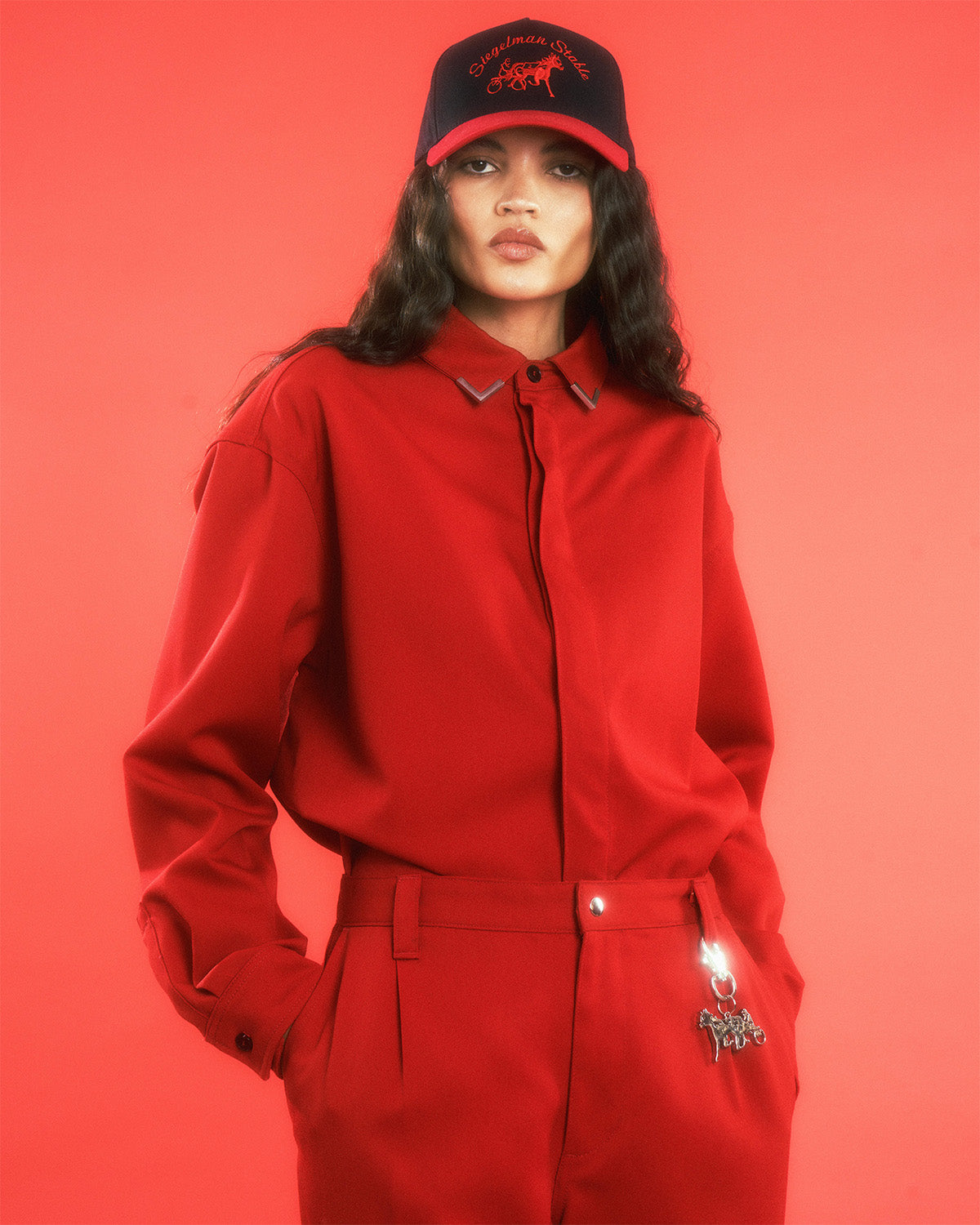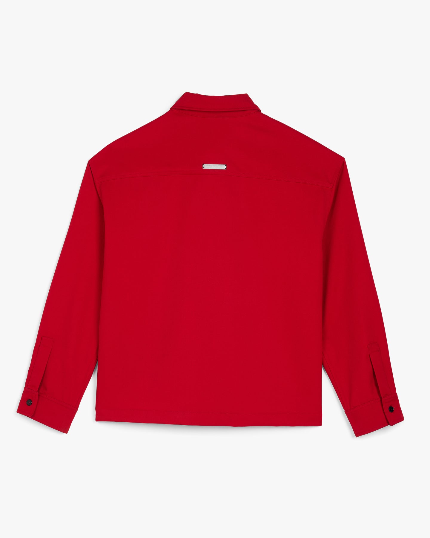Red long sleeve button up featuring metal collar tip hardware and metal engraved plate on back lower collar.