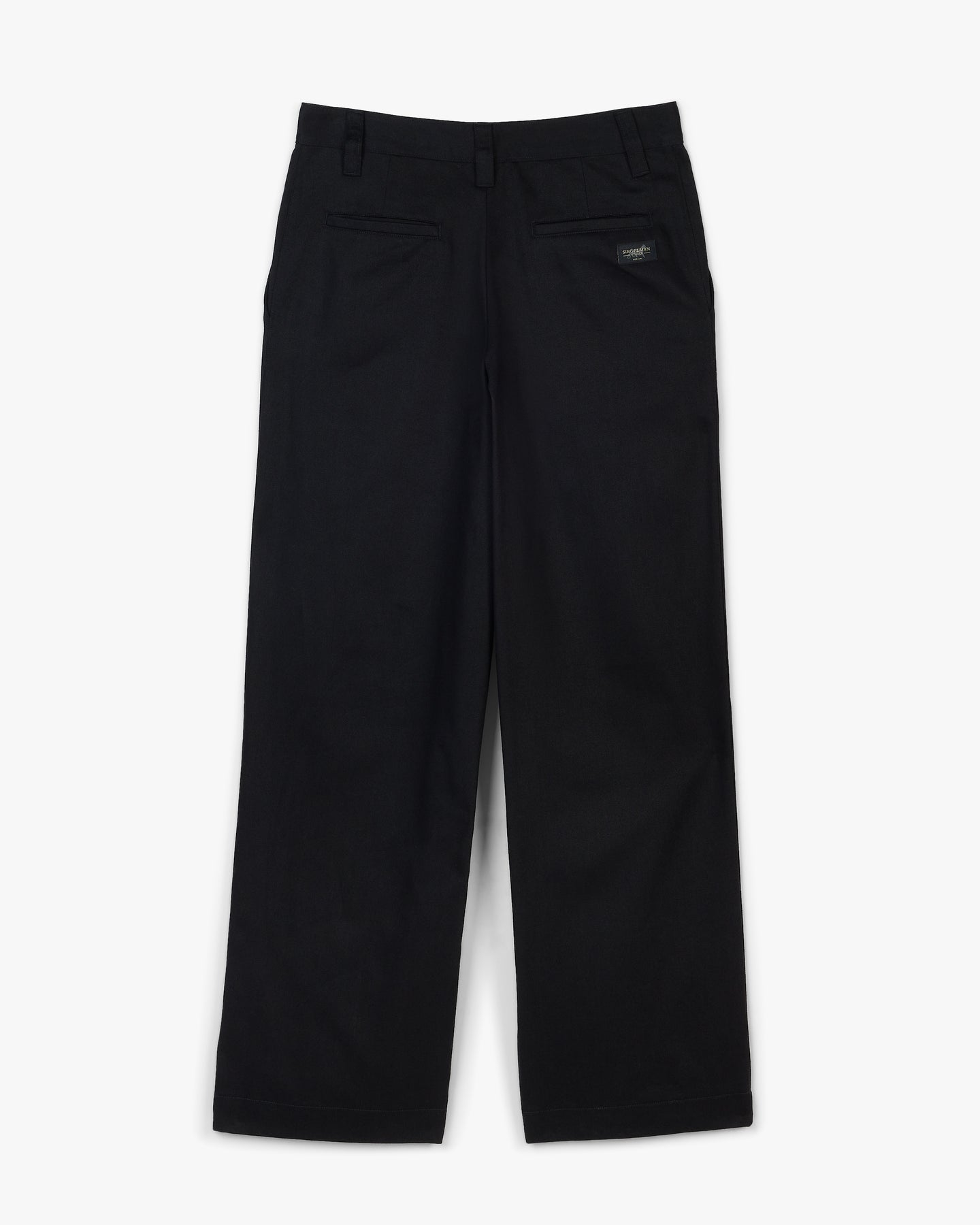 Black cotton pleat pant featuring woven Siegelman Stable patch logo on wearers back right pocket.