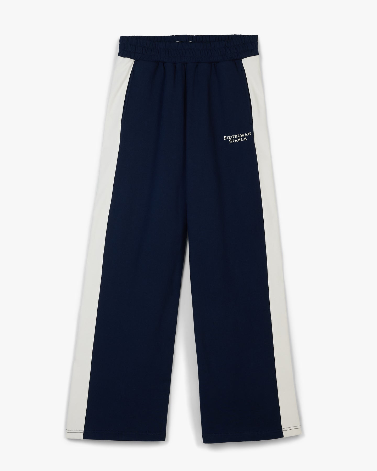 Navy flared leg sweatpants with side panels down both legs. Siegelman Stable embroidery below left pocket and on back right pocket.