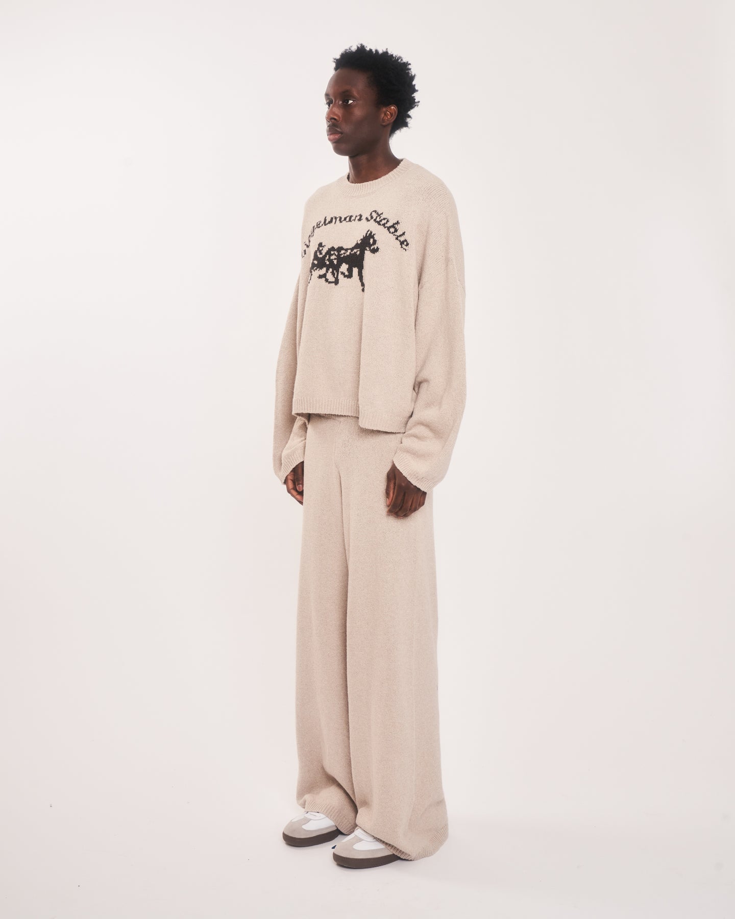 chickpea tricot knit pant with Siegelman Stable patch logo on waistband.