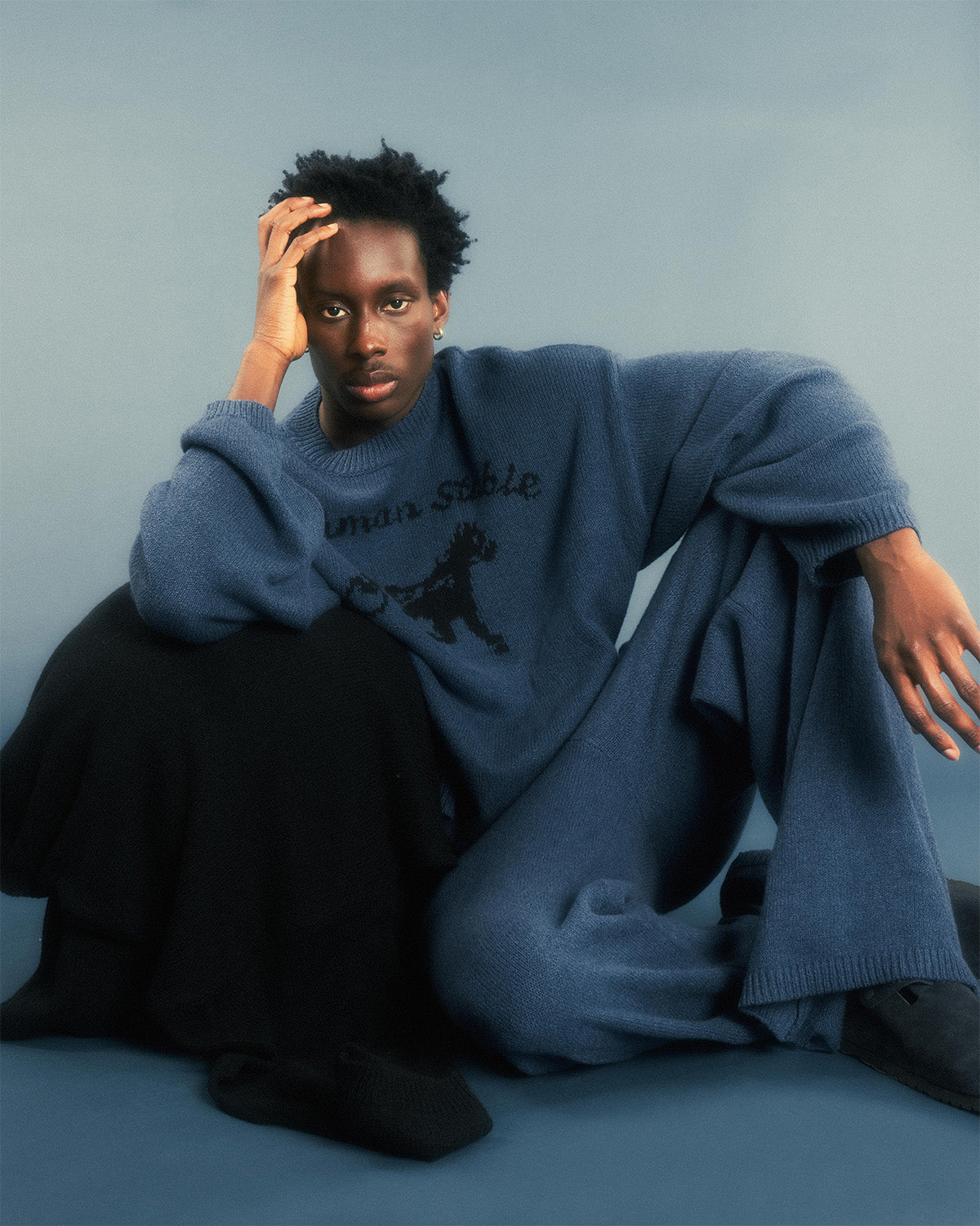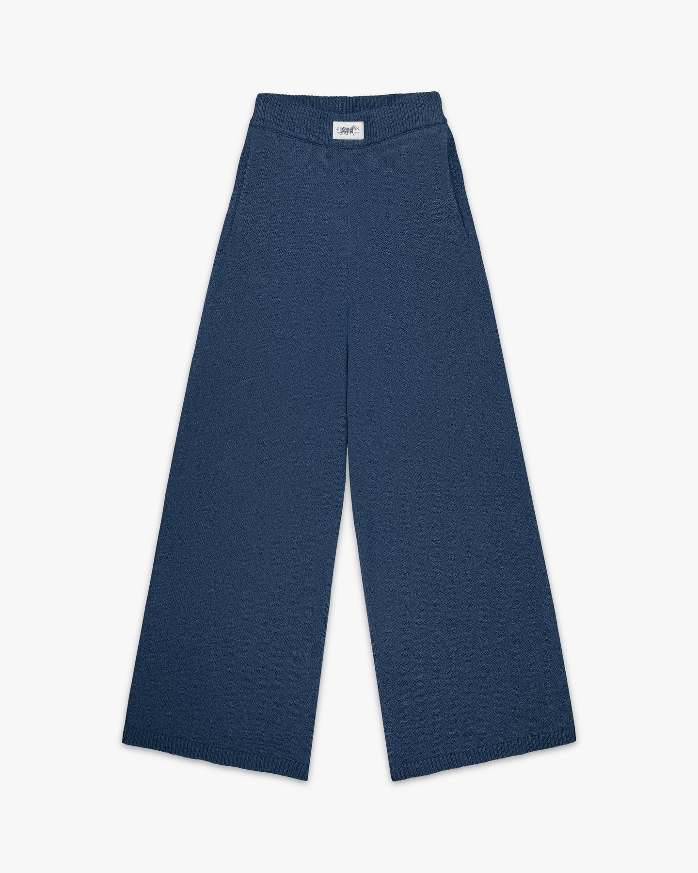 Berber Blue tricot knit pant with Siegelman Stable patch logo on waistband.