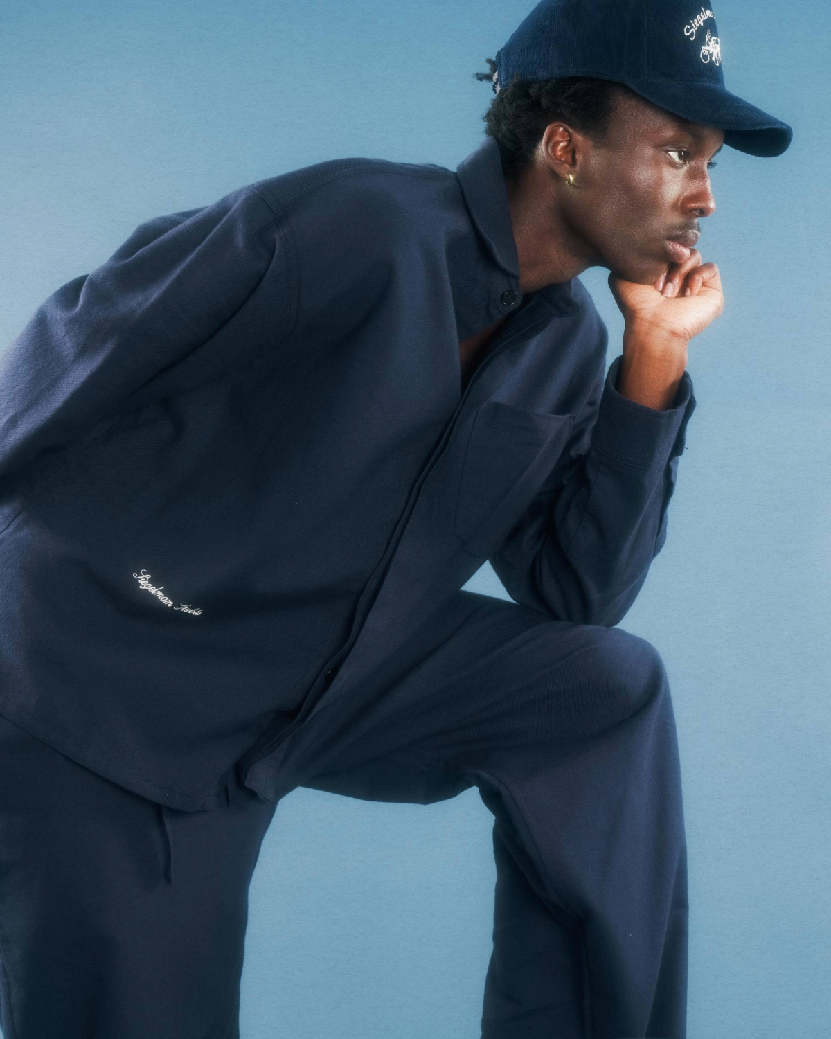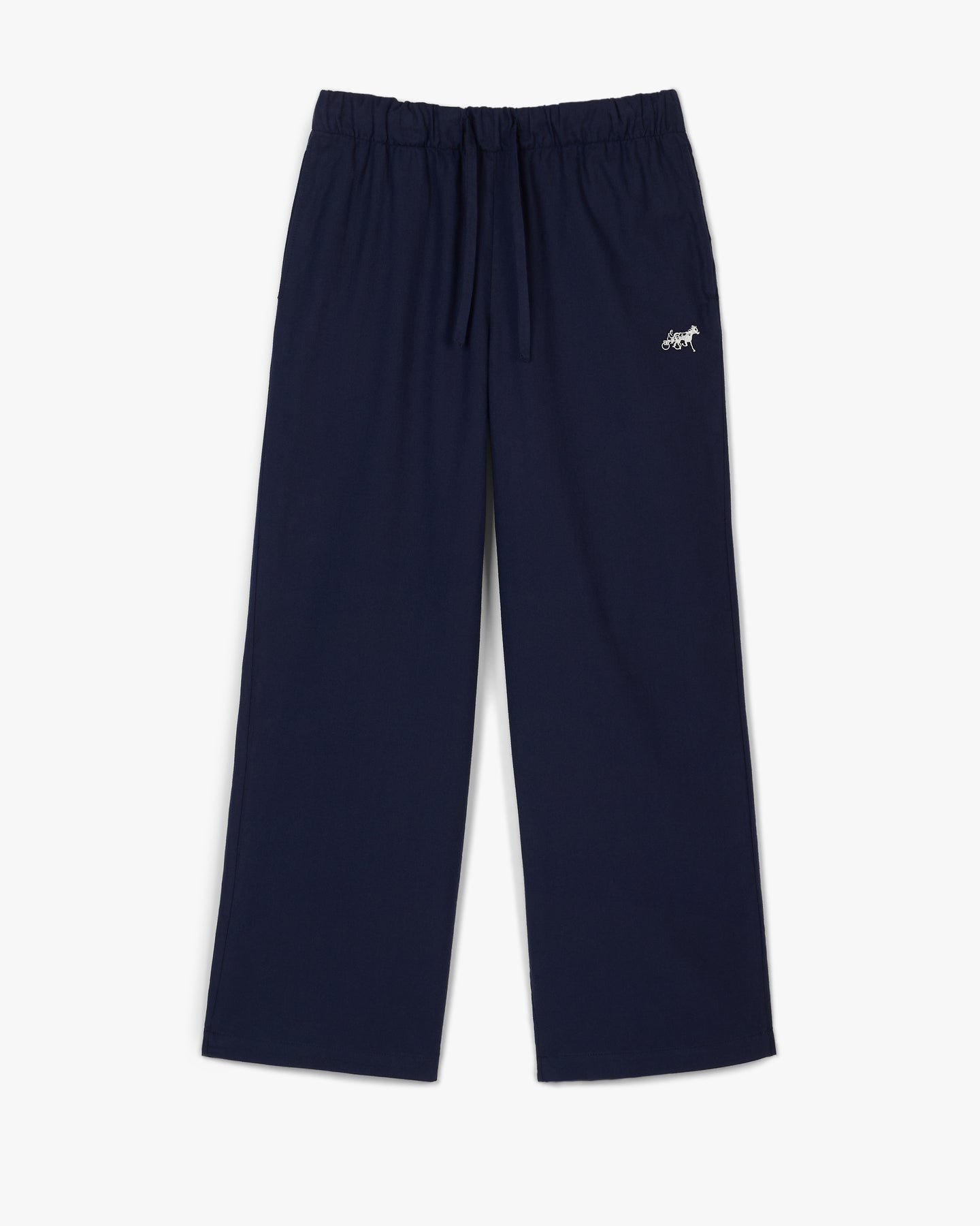 Pajama pant in navy with vaporous gray Siegelman Stable logo placed on wears-left thigh.