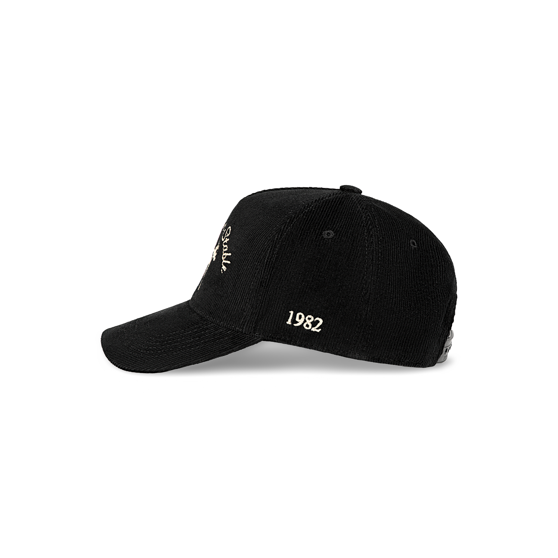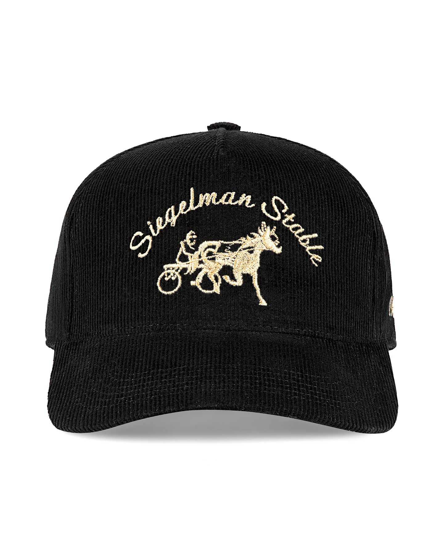 Black Corduroy five panel Siegelman Stable hat with wheat gold logo embroidery.