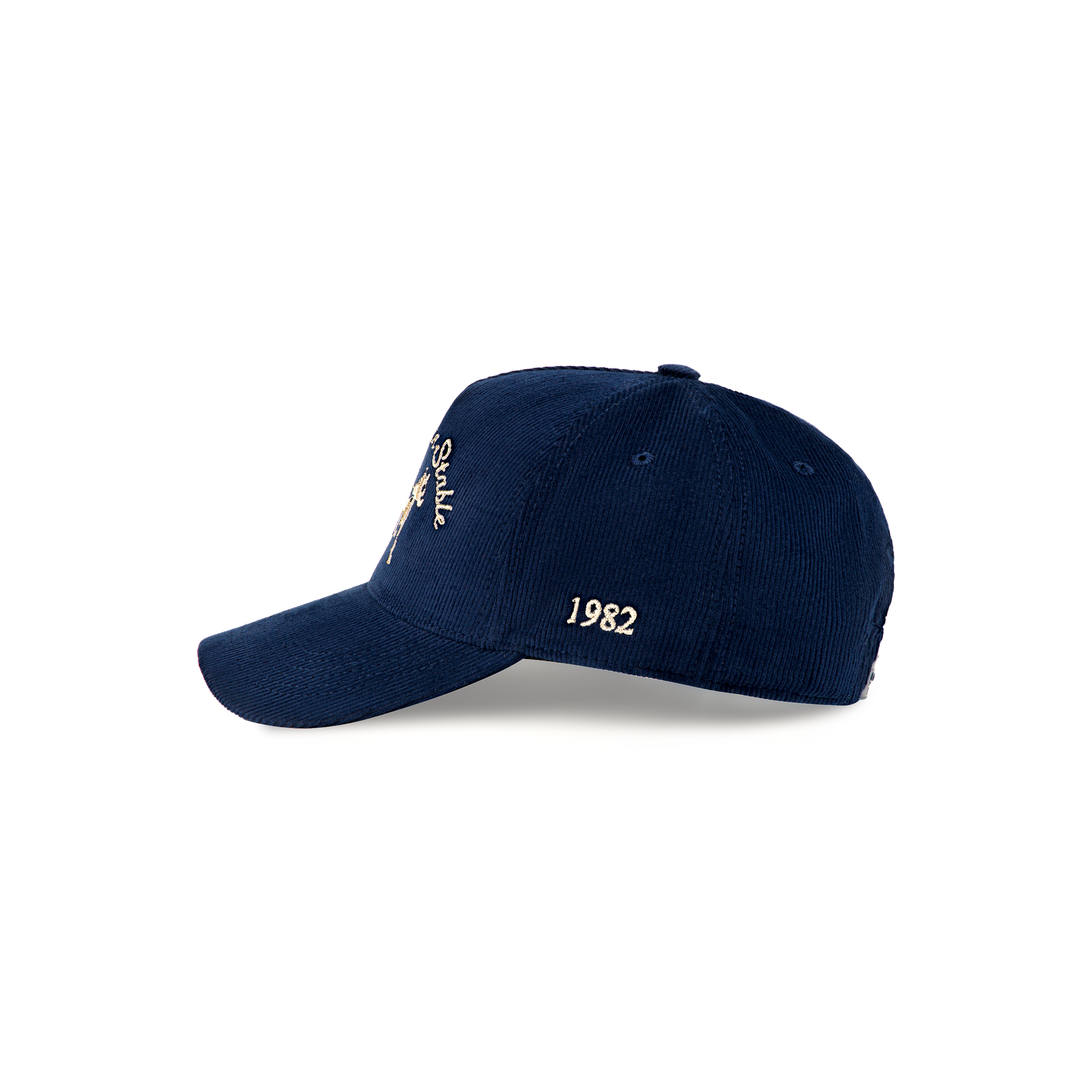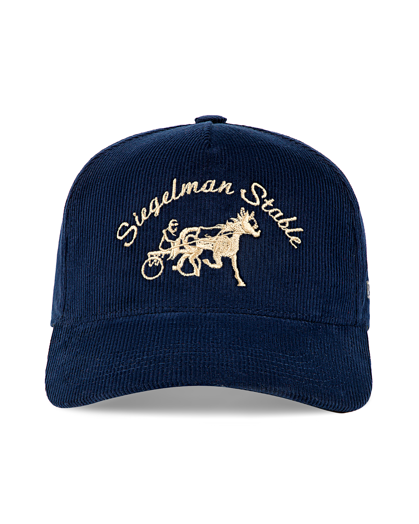 Navy Corduroy five panel Siegelman Stable hat with wheat gold logo embroidery.