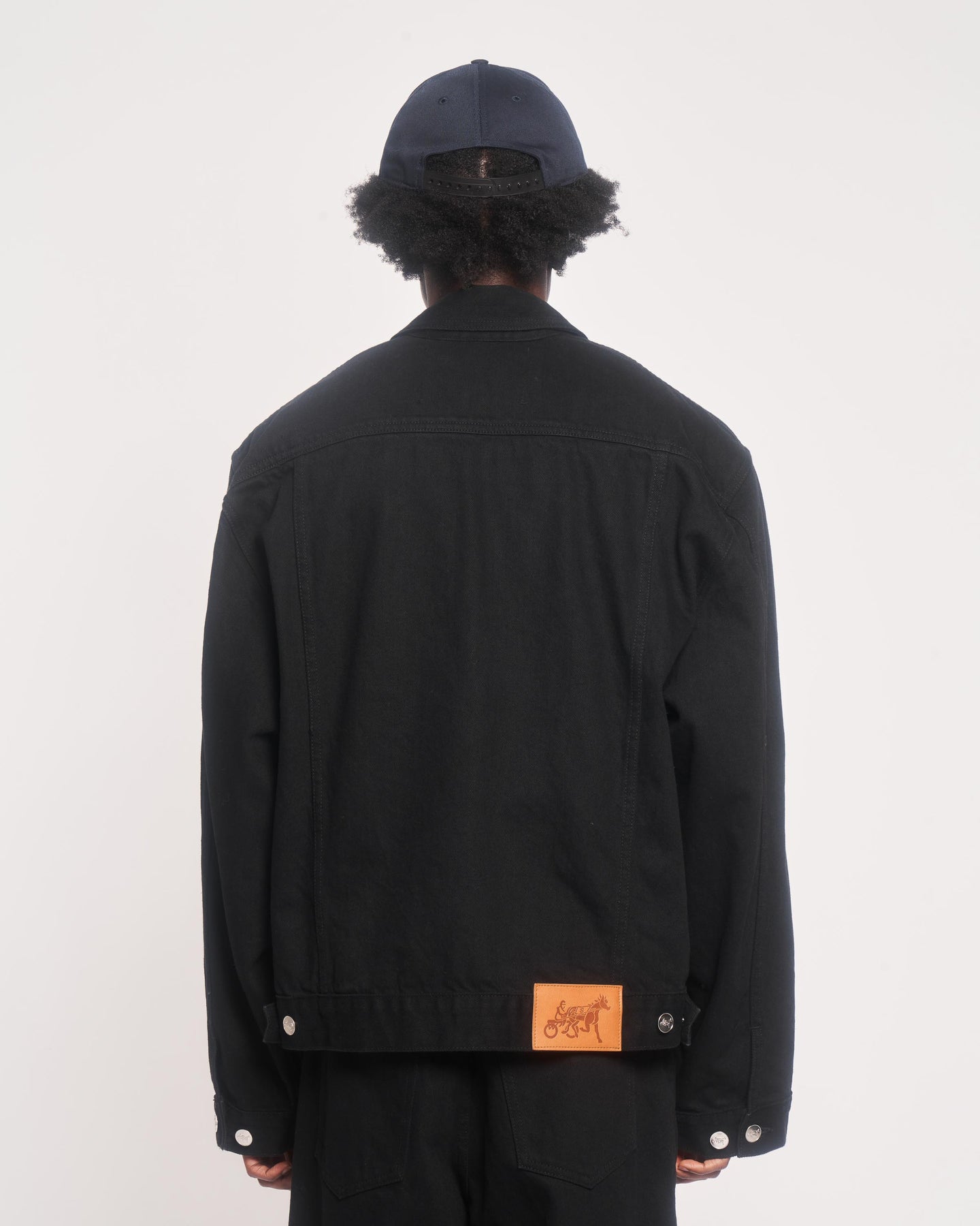 Black Denim Jacket featuring silver buttons and a signature Siegelman Stable nameplate on the wearer’s left side. Models wears a medium.