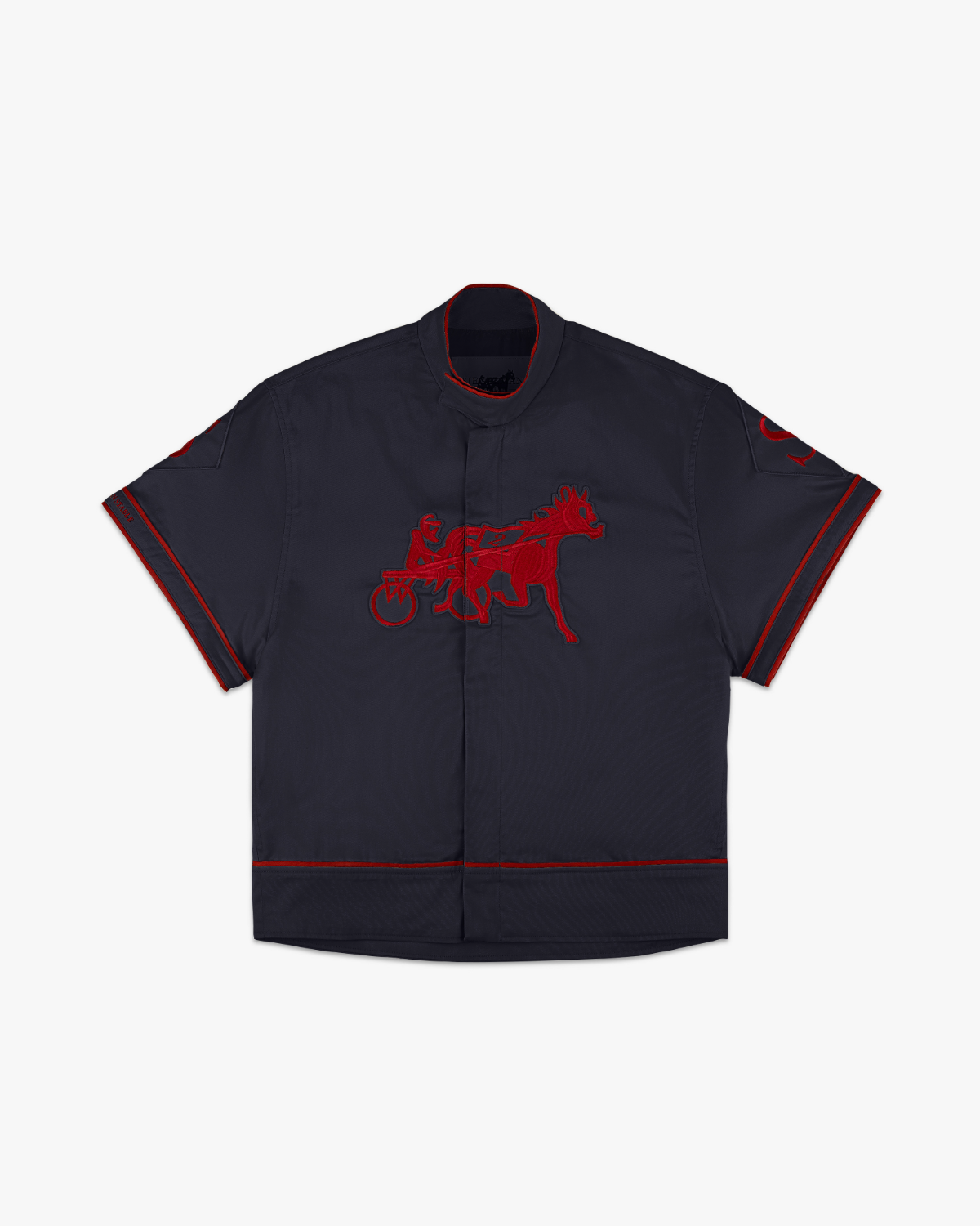 Navy Short Sleeve Track Jacket featuring red Siegelman Racing Stable logo across wearer's front chest.