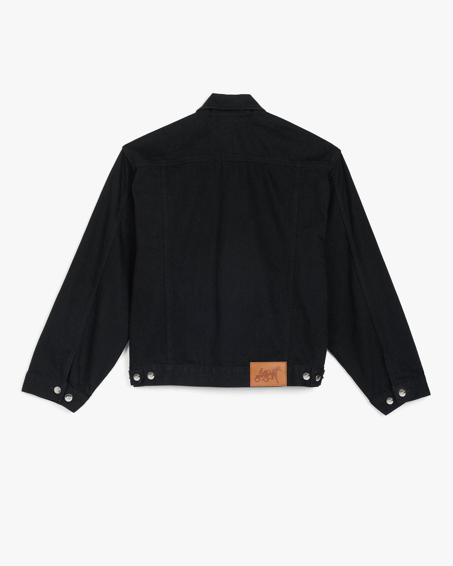 Black Denim Jacket featuring silver buttons and a signature Siegelman Stable nameplate on the wearer’s left side. Models wears a medium.