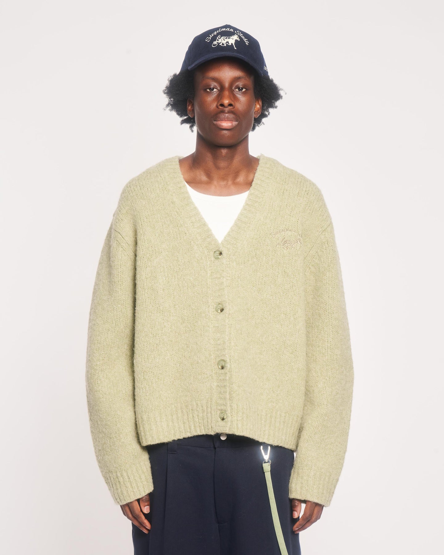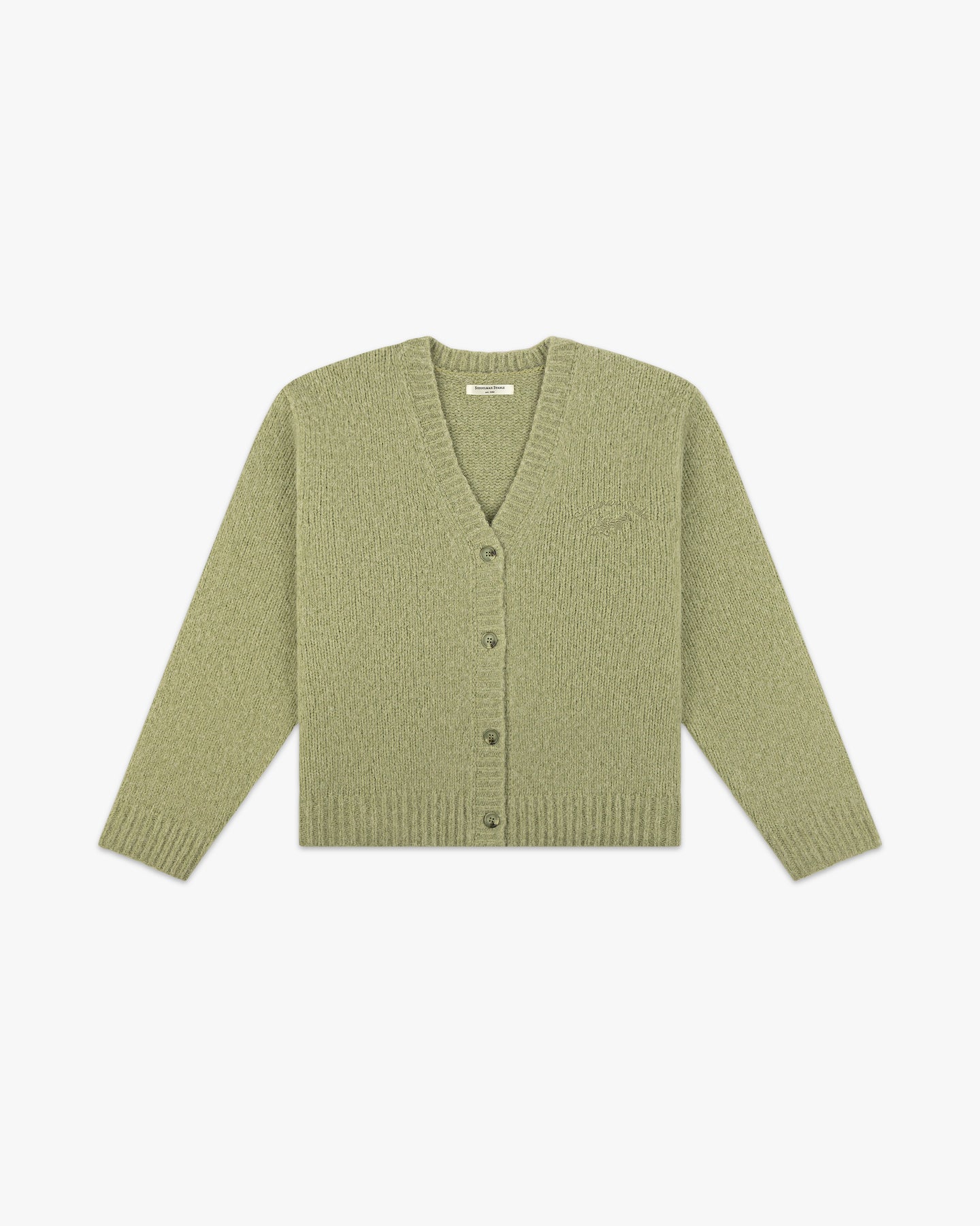 Seafoam green knit cardigan with Siegelman Stable logo