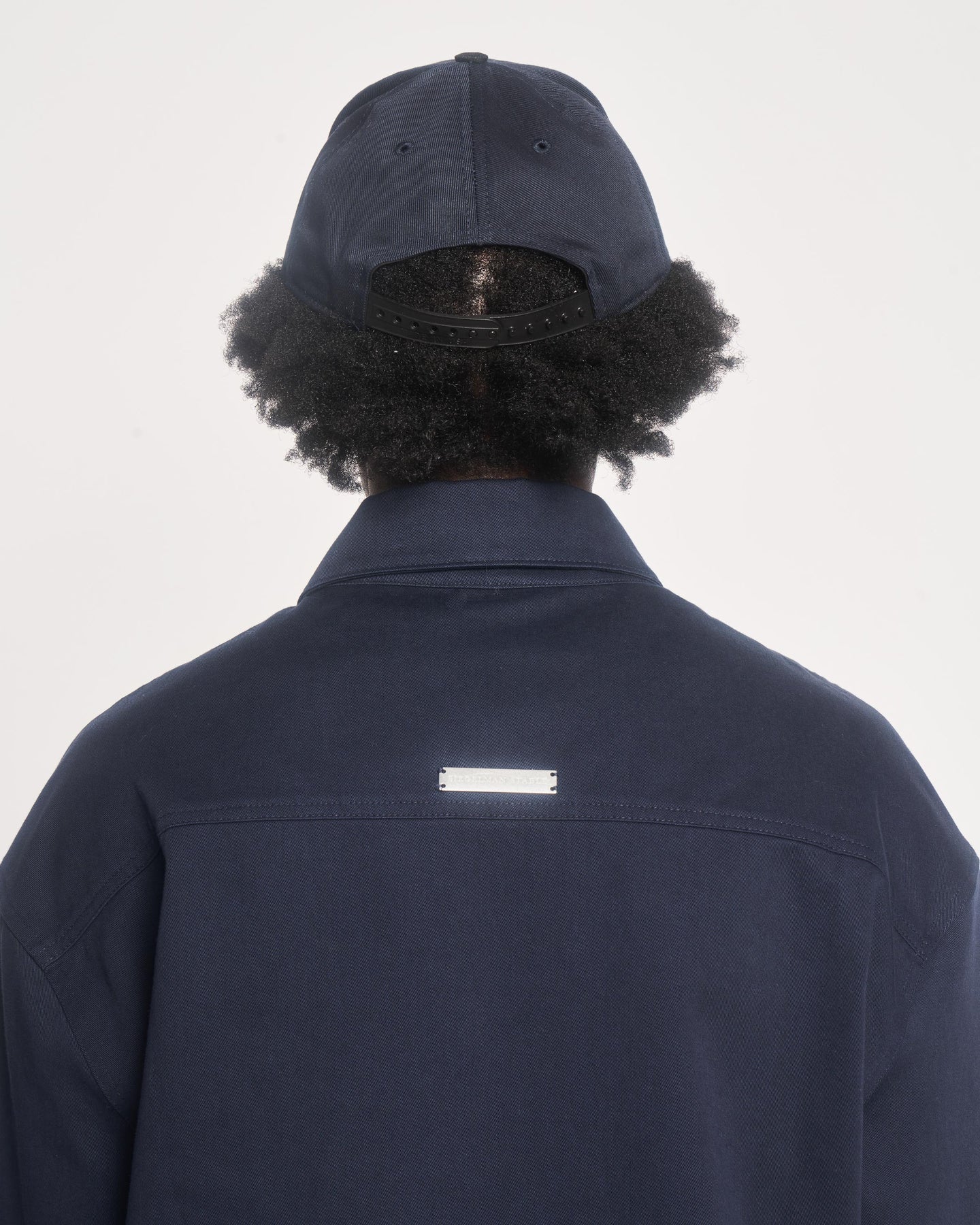 Navy long sleeve button up featuring metal collar tip hardware and metal engraved plate on back lower collar.