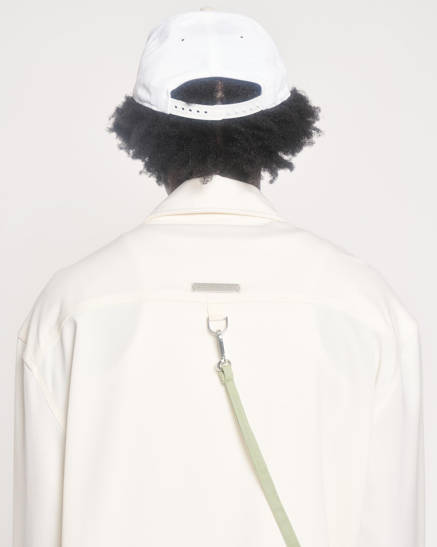 Vaporous gray long sleeve button up featuring metal swivel clip with seafoam green removable harness strap and metal engraved plate on back yoke.