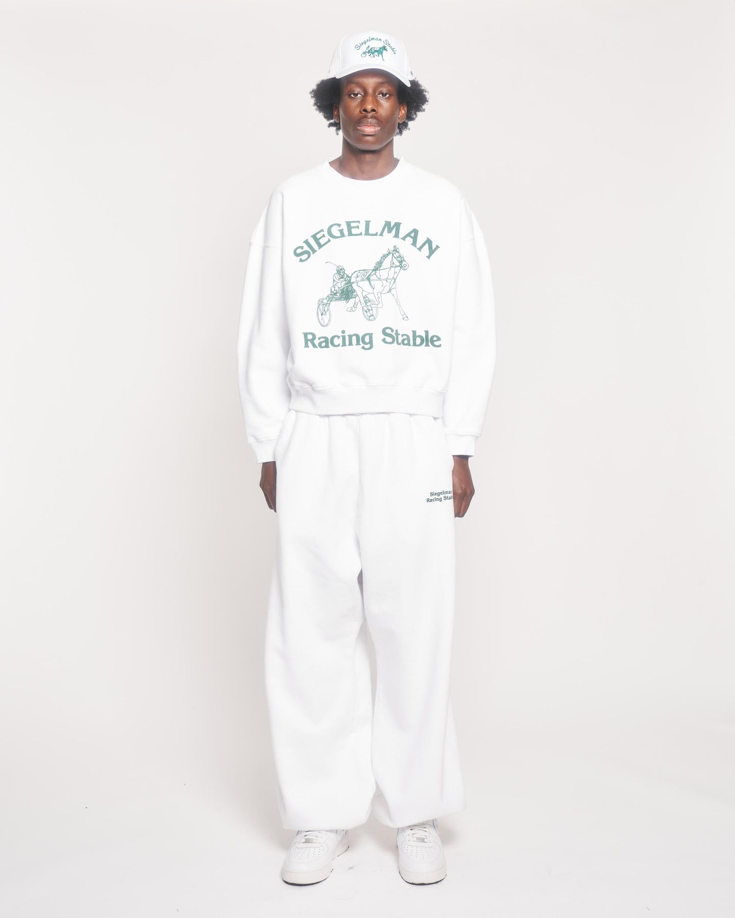 Racing Stable sweatpant in bright white with green screenprint Siegelman Stable logo on wearer's upper-left thigh.