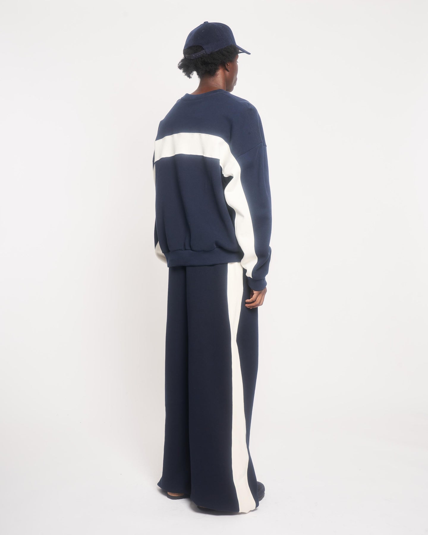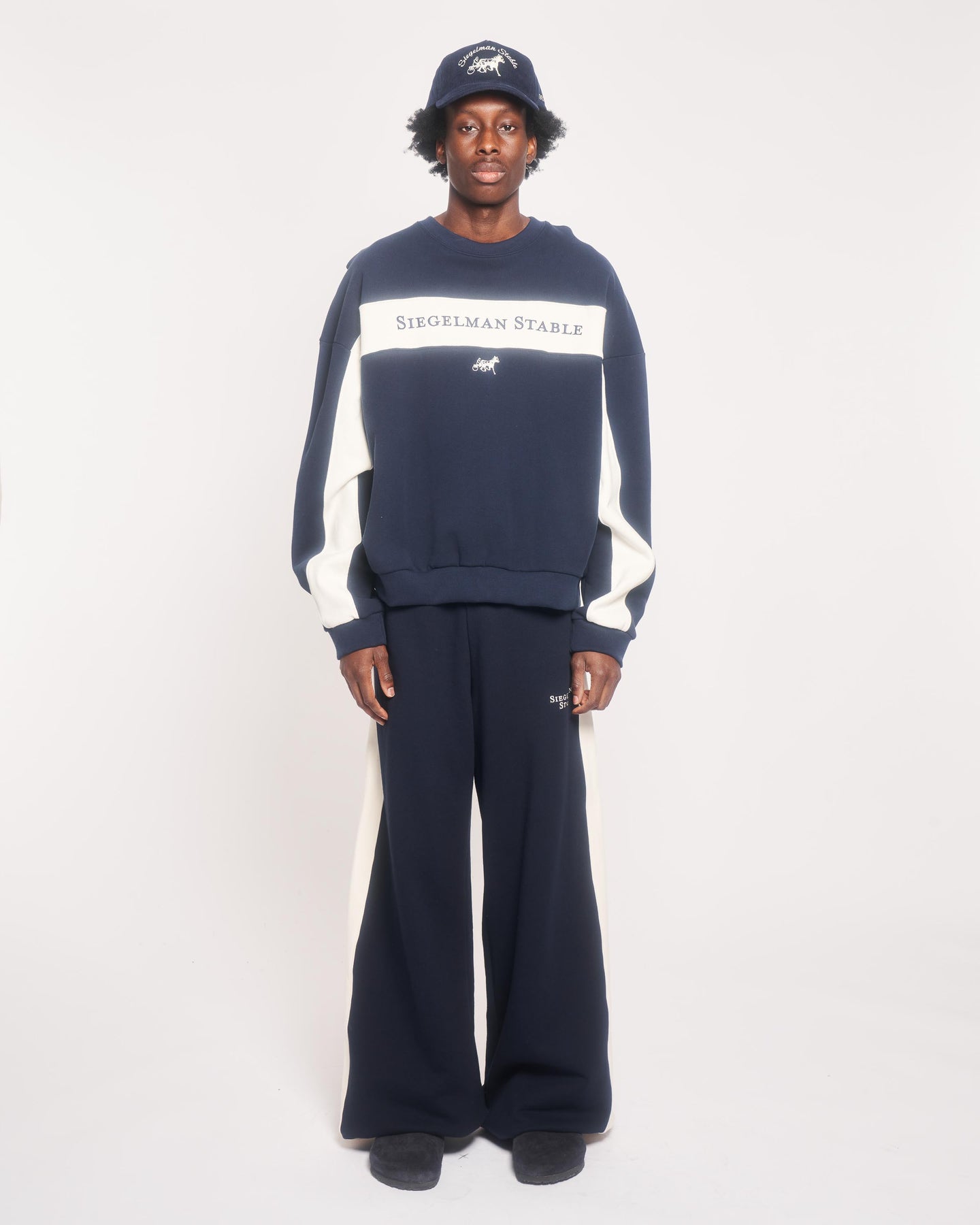 Navy flared leg sweatpants with side panels down both legs. Siegelman Stable embroidery below left pocket and on back right pocket.